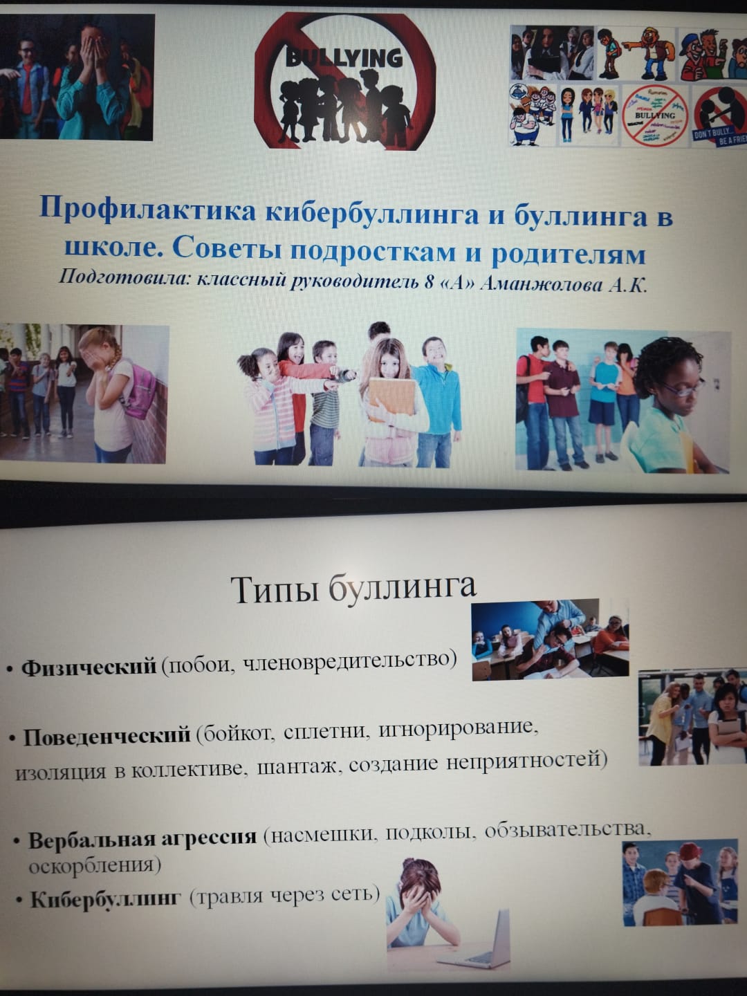 12 февраля в 8"А" классе кл. Рук. Аманжоловой А.К. проведен классный час на тему: Буллингу и кибербуллингу, жестокости и насилию нет места в мире детства.